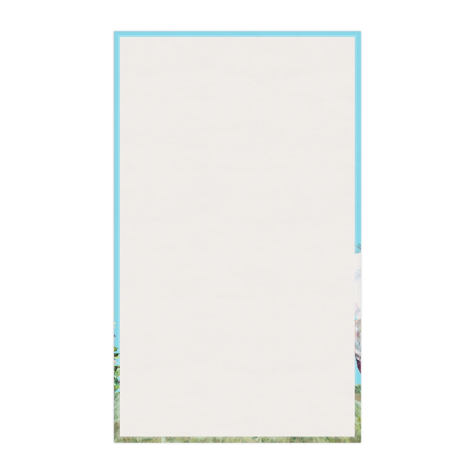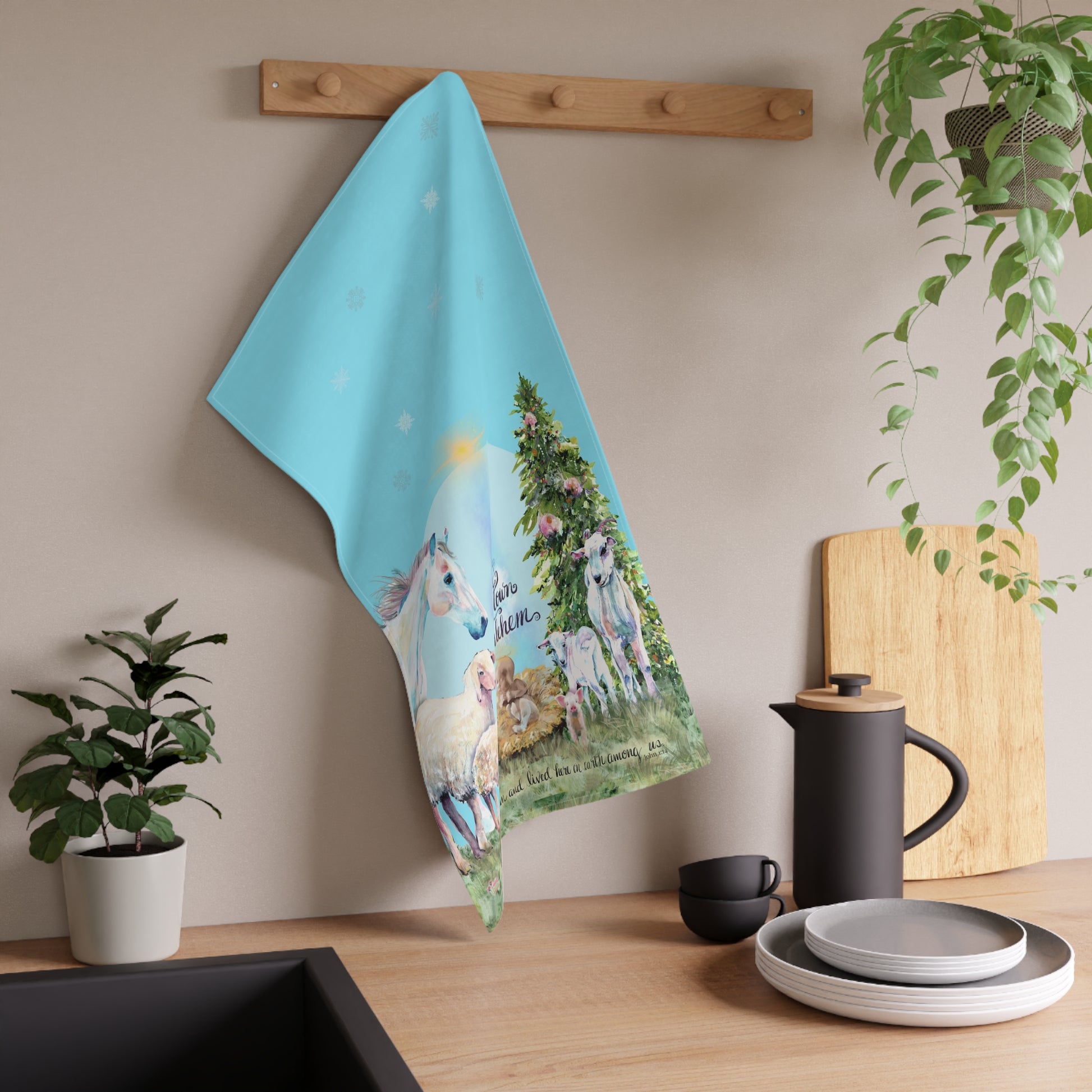 The Christmas manger scene of baby Jesus surrounded by farm animals is illustrated by Texas artist, Anne Gregory, along with a hand-lettered Bible verse, "The Word became human and lived here on earth among us." John 1:14.