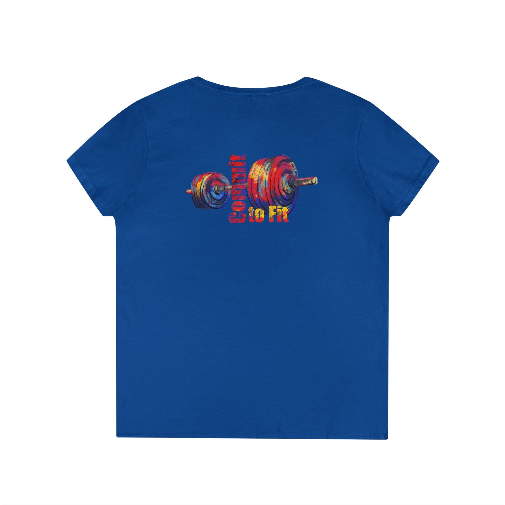 Ladies' V-Neck T-Shirt features custom "Commit to Fit"© brand logo of the fabulous fitness trainer, Carol Haynes of the Club of New Territory in Sugar Land, Texas. Designed for comfort and functionality, it is perfect for Boot Camp gym enthusiasts and fitness lovers. The semi-fitted cut allows for easy movement during workouts while maintaining a flattering shape. Made from 100% cotton, this tee is soft against the skin, making it ideal for daily wear. Whether you're hitting the gym, meeting friends, or lounging at home, this shirt suits any casual occasion. Perfect for gifting during holidays, birthdays, or just because, it's a thoughtful choice for anyone committed to their fitness journey.