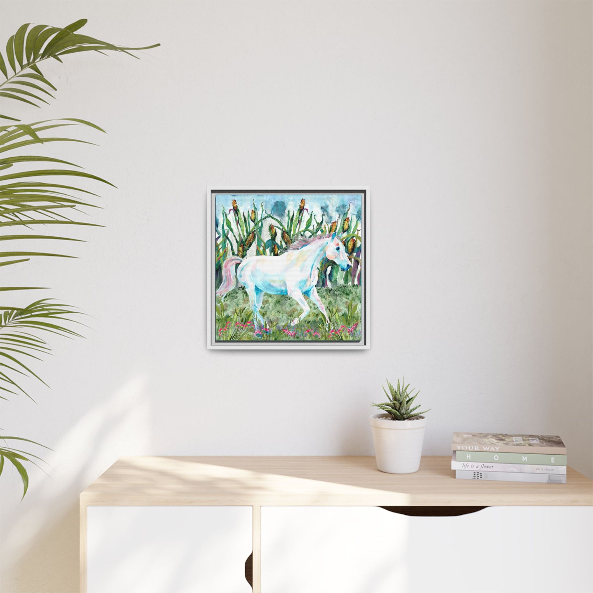 A graceful white horse with a flowing mane frolics in a cornfield. A peaceful country scene by Texas artist Anne Gregory. Perfect for farmhouse and ranch decor, cottagecore, nursery, and animal lovers.